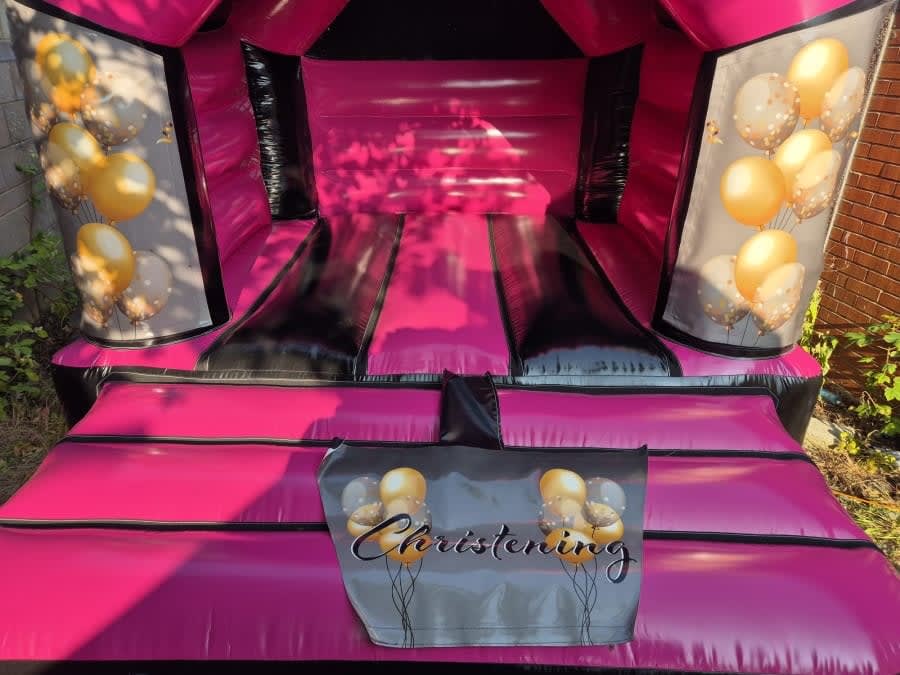 Make your christening unforgettable with the Black & Pink Castle (12ft by 14ft) - Christening theme. This elegant bouncy castle blends sophisticated black accents with soft pink details. It creates a picture-perfect backdrop for photos and a safe play zone kids love. ππΈ