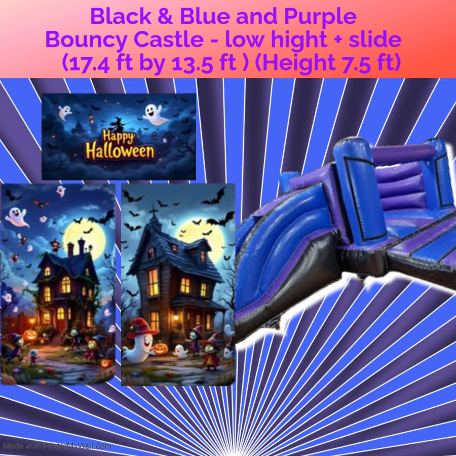 The Purple & Blue Castle with low slide (14ft by 18ft) - Christening theme brings soft, celebratory charm to your celebration. This inflatable bounce house blends a gentle Christening aesthetic with playful design. It features a safe low slide for toddlers and young children. Bright purple and blue colors create a joyful backdrop for photos and memories. Ideal for christenings, baby showers, and family parties. πΆβ¨
