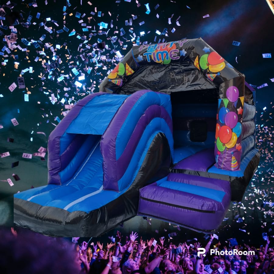 Bring the party to your backyard with the Disco Combo (12ft x 15ft). This eye-catching bounce house combines a roomy bouncing area with a built-in front slide, disco lights, and a Bluetooth speaker. It’s perfect for birthdays, school events, and community gatherings. Colorful blue and purple panels create a lively vibe. Raincover included for light weather protection. 🌈🔊