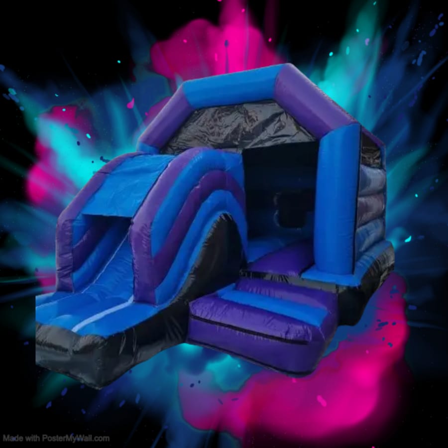 Bring the party to your backyard with the Disco Combo (12ft x 15ft). This eye-catching bounce house combines a roomy bouncing area with a built-in front slide, disco lights, and a Bluetooth speaker. It’s perfect for birthdays, school events, and community gatherings. Colorful blue and purple panels create a lively vibe. Raincover included for light weather protection. 🌈🔊